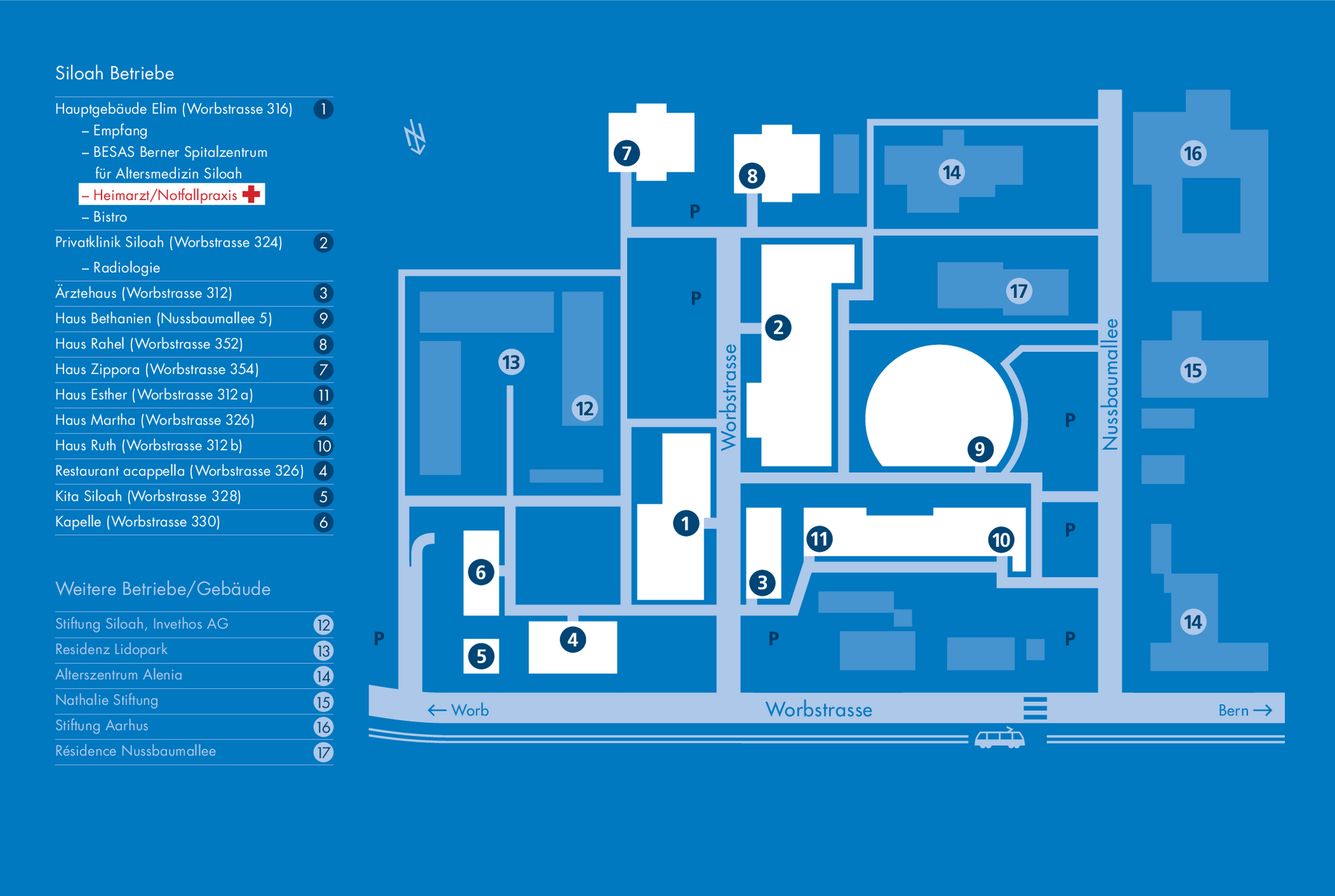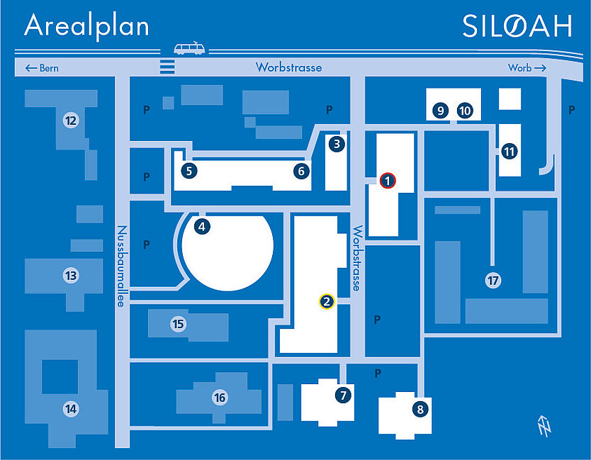 Auch mit privaten Verkehrsmitteln ist die Siloah einfach zu erreichen: Verlassen Sie die Autobahn A6 bei Muri und fahren Sie die Schnellstrasse Richtung Worb. Beim nächsten Kreisverkehr fahren Sie Richtung Gümligen und erreichen die Siloah nach wenigen Hundert Metern. Gebührenpflichtige Parkplätze (von 07.00 – 11.30 Uhr und von 13.30 – 17.00 Uhr) finden Sie auf dem ganzen Siloah-Areal. Bitte beachten Sie, dass die Anzahl Parkplätze sehr beschränkt ist. Wir empfehlen Ihnen die Anreise mittels ÖV oder Taxi.
